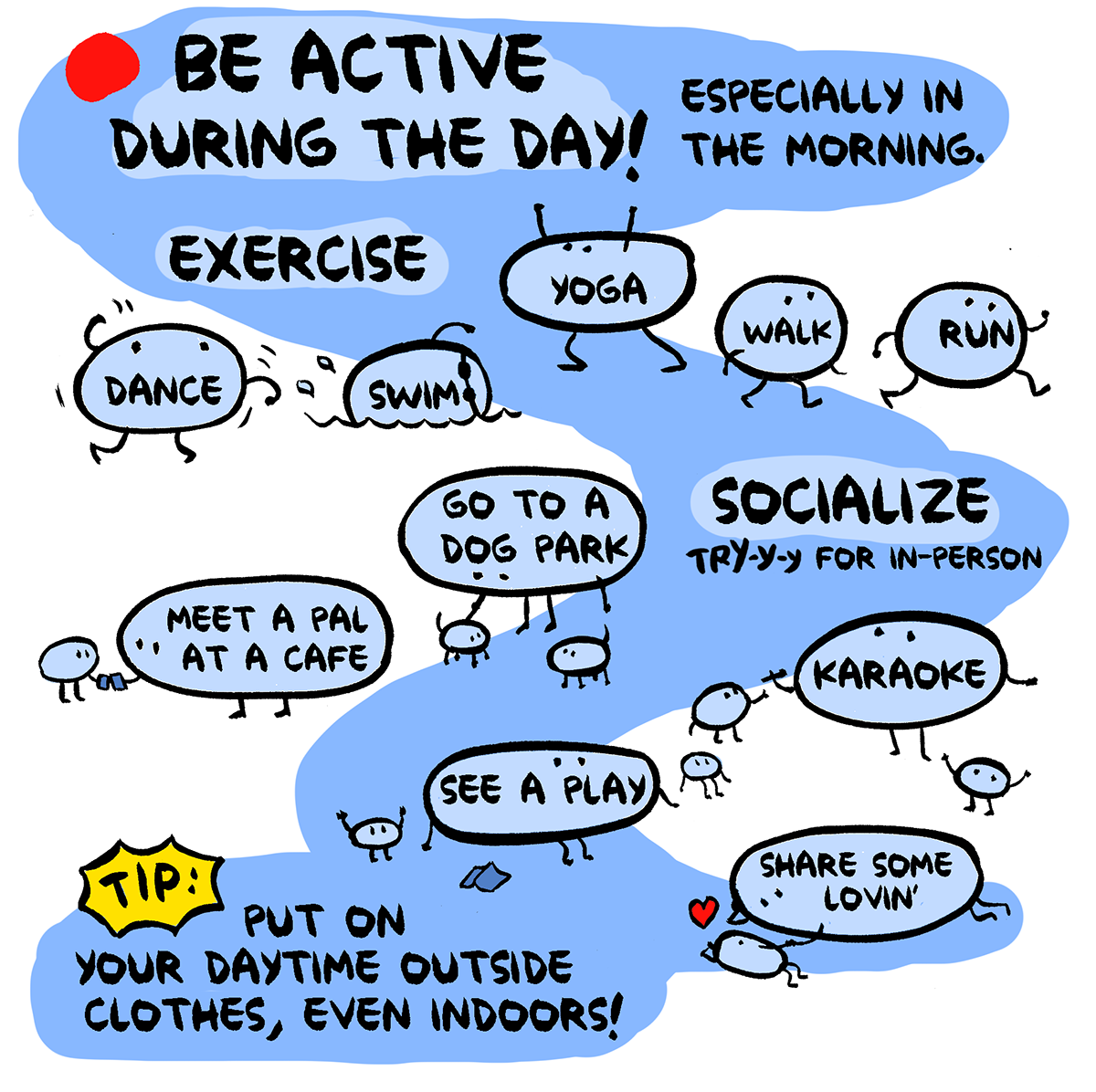 Panel 8 - Text: Be active during the day! Especially in the morning. Exercise: dance, swim, yoga, walk, run. Socialize, and try for in-person: go to a dog park, meet a pal at a café, see a play, karaoke, share some lovin’. Tip: put on your daytime outside clothes, even indoors! Art: Blob characters with aforementioned activities written on them.